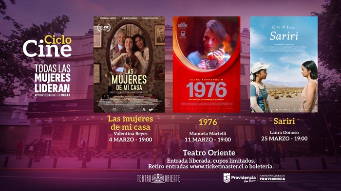 Tres películas de autoras nacionales dan inicio a la conmemoración del mes de la mujer en la Fundación Cultural de Providencia bajo el lema #TodasLasMujeresLideran. Se trata de un ciclo que destaca a directoras y su especial sello femenino en el séptimo arte local, exhibiendo tres sobresalientes cintas: “Las mujeres de mi casa” de Valentina Reyes (miércoles 4 marzo); “1976” de Manuela Martelli (miércoles 11 marzo); y “Sariri” (miércoles 25 de marzo), todas a las 19:00 horas en la pantalla del Teatro Oriente.